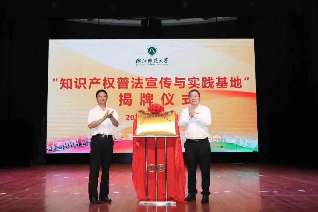 金华中院党组副书记、副院长宋耿金与浙师大校长郑孟状为“知识产权普法宣传与实践基地”揭牌。#02