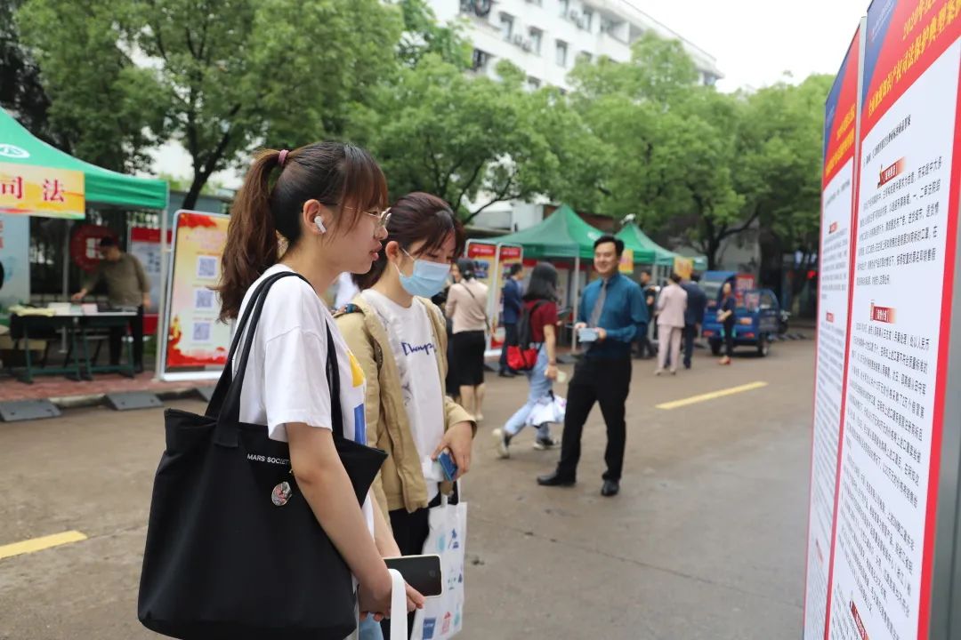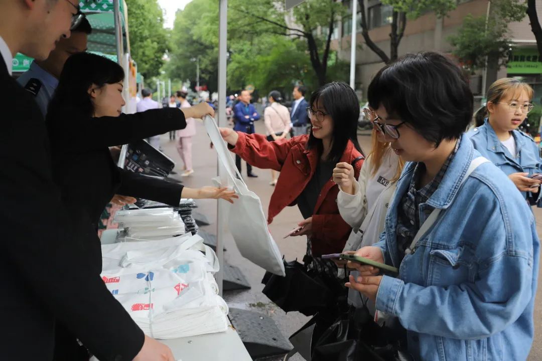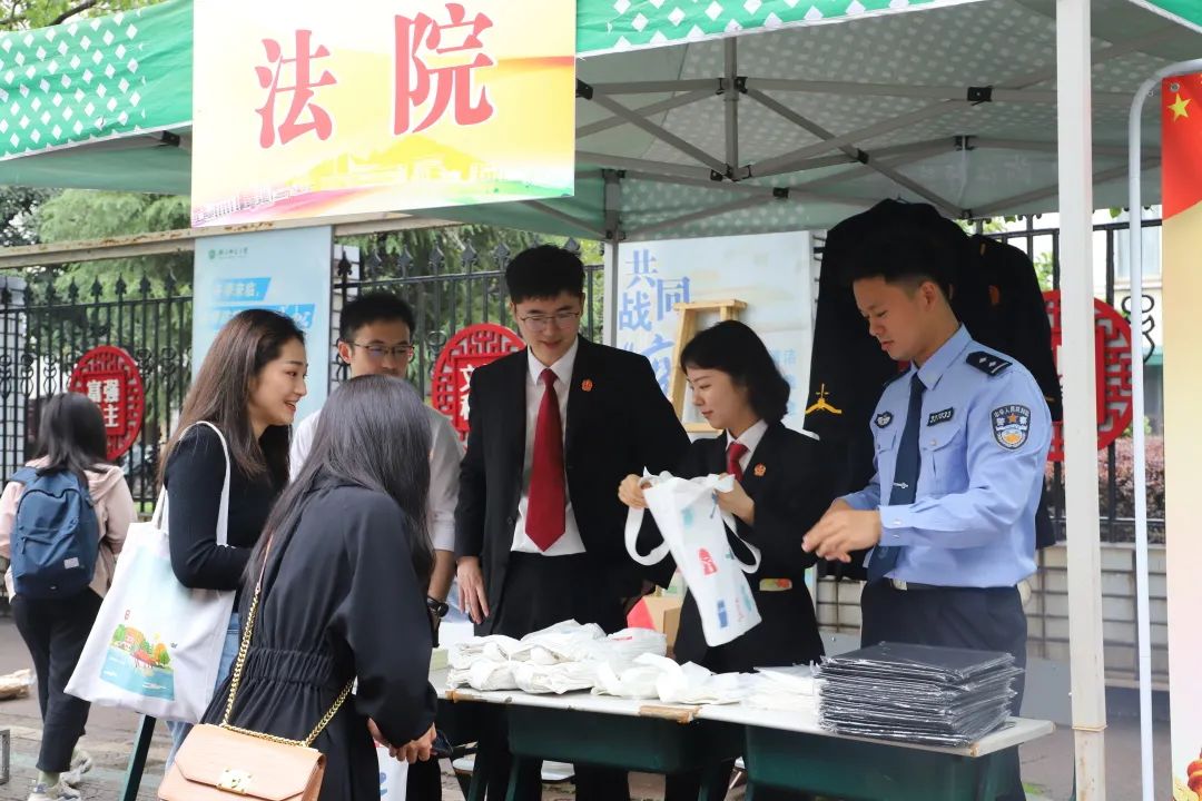 在浙师大杏园主干道上,金华中院搭建了“职业体验棚”,准备了法袍、法槌以及法院衍生文化产品,学生们可以在现场扮演法官,提前“走进”法庭,过足瘾。#03