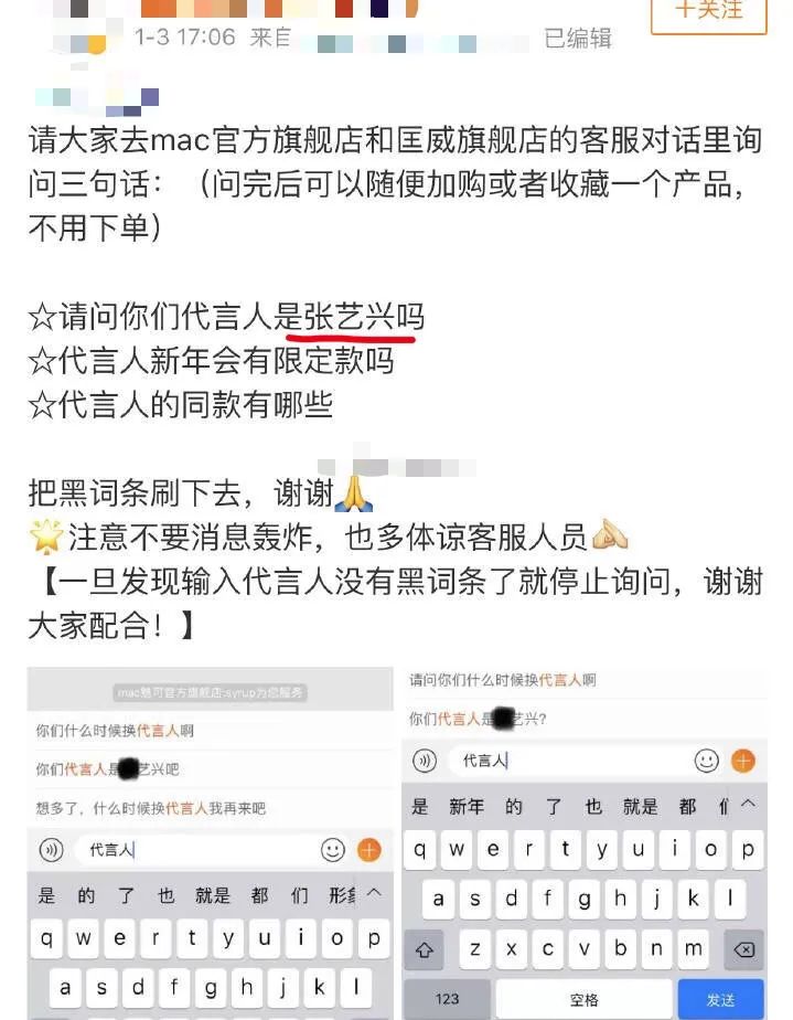 比如张艺兴在代言MAC期间,客服对话框的“代言人”联想词却变成了“孙艺兴”。