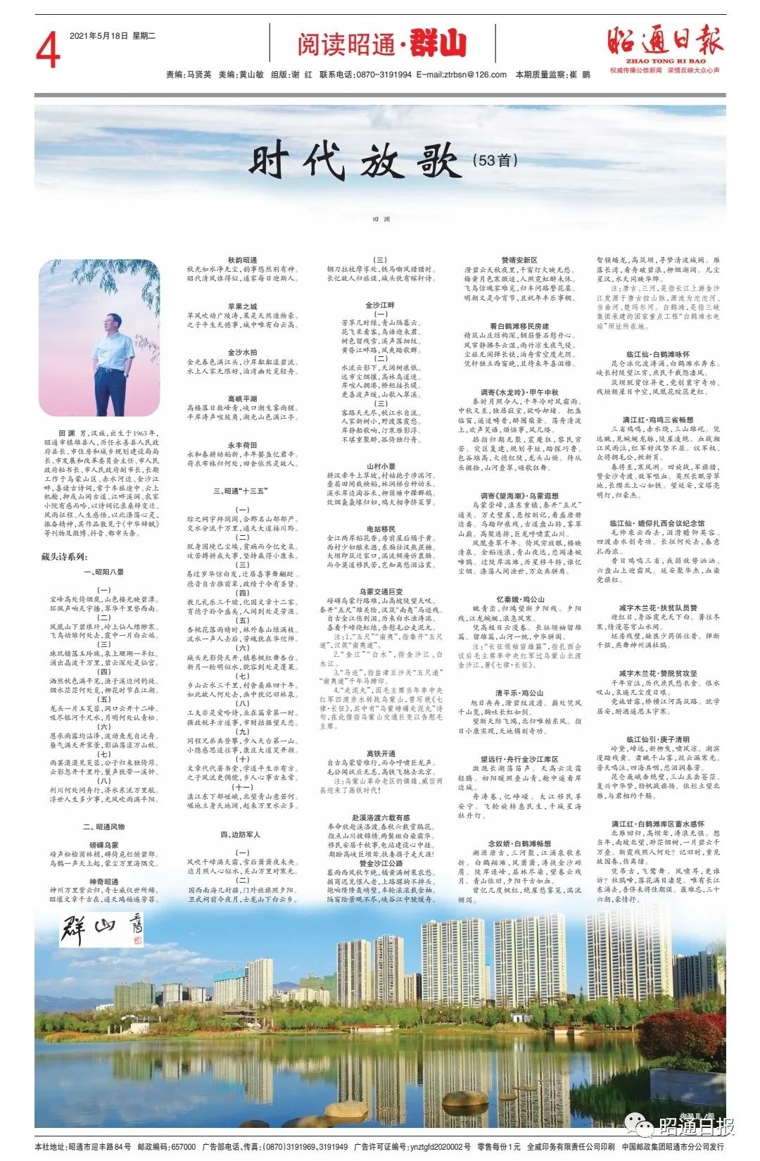 田渊,出生于1963年, 昭通市镇雄县人,历任永善县人民政府县长、市住房和城乡规划建设局局长、市发展和改革委员会主任、市人民政府秘书长、市人民政府副市长,长期工作于乌蒙山区、赤水河边、金沙江畔,喜读古诗词,常于车旅途中、云上机舱,抑或山间古道、江畔溪涧、农家小院有感而吟,以诗词记录桑梓变迁、风雨征程、人生感悟,以此涤荡心灵, 振奋精神,其作品散见于《中华辞赋》 等刊物及微博、抖音、都市头条。一、昭阳八景
