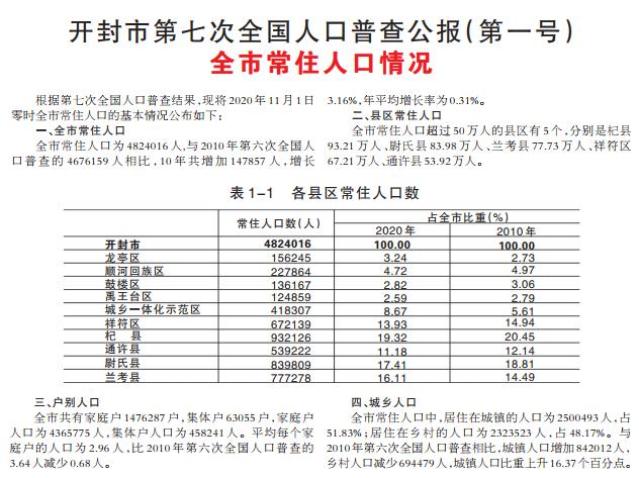 全市常住人口超过50万人的县区有5个,分别是杞县93.21万人、尉氏县83.98万人、兰考县77.73万人、祥符区67.21万人、通许县53.92万人。