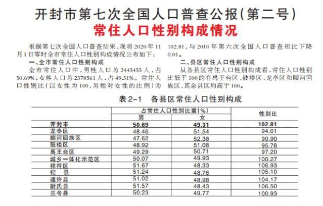 从各县区常住人口性别构成看,常住人口性别比低于100的有禹王台区、鼓楼区、龙亭区和顺河回族区,其余县区均高于100。