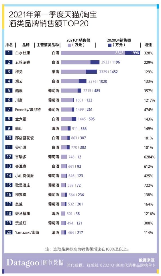 据统计,2021 年第一季度天猫、淘宝销售渠道上,销售额增速在 100% 及以上的酒类品牌有 2449 家。其中销售额前十名,白酒就占了一半。