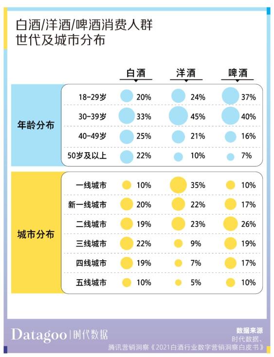 腾讯营销洞察报告也指出,相比于洋酒和啤酒,白酒消费者的年龄和地域覆盖面更广、更均衡。