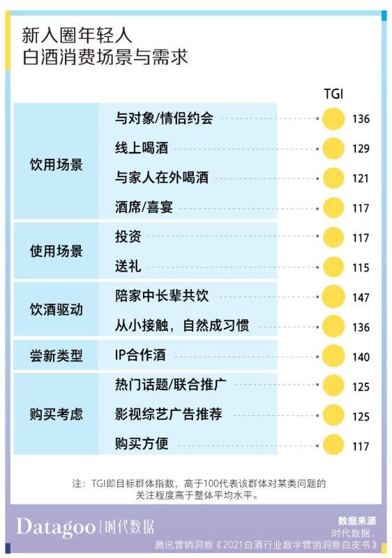 数据显示,新入圈的年轻白酒消费者在消费场景和需求上已经和中老年群体大不相同。