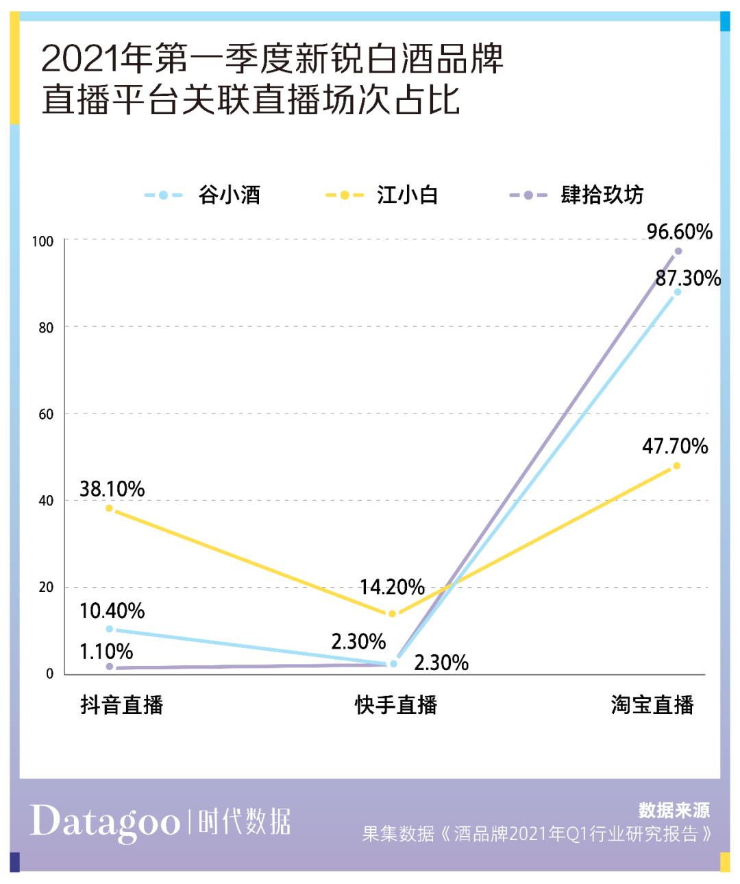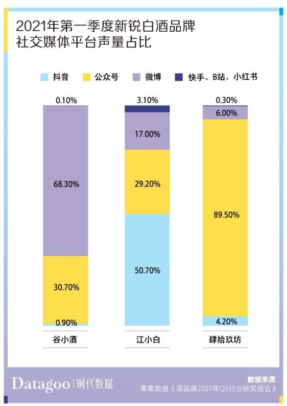 以江小白、谷小酒和肆拾玖坊为例,在第一季度里,江小白在各平台都有排兵布阵,近半声量来自抖音,谷小酒发力点则主要在微博,肆拾玖坊基本是以微信为主战场。谷小酒和肆拾玖坊都有着更浓厚的互联网气息。谷小酒主要成员来自京东、小米、阿里等互联网大厂,2021 年第一季度淘宝天猫平台销售额较上一季度上涨 101% ;肆拾玖坊则是通过跨界众筹的方式成立的互联网品牌,召集了 49 位 IT 界精英。