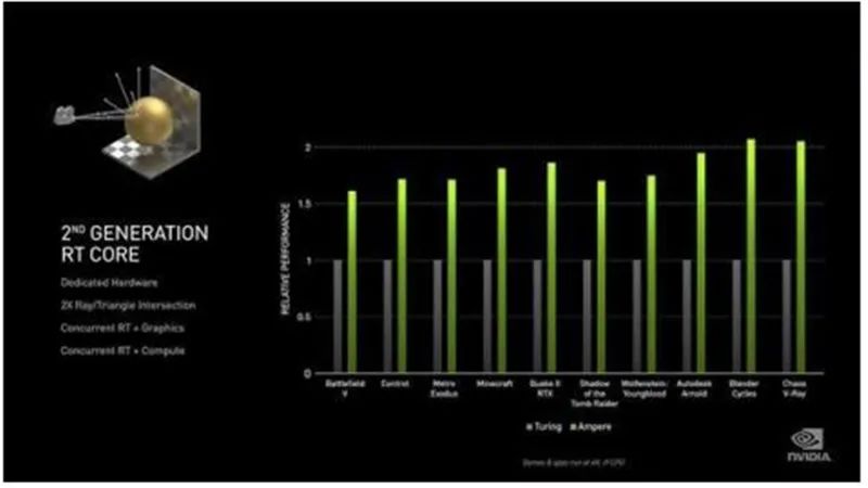 以显卡为例,2020 年9 月,NVIDIA 正式发布了基于 Ampere 安培架构的 GeForce RTX 30 系列显卡,包括 RTX 3090、RTX 3080、RTX 3070 三款型号。从性能来看,根据 NVIDIA 官方,新产品对比 Turing 图灵架构的上一代产品性能提升 2 倍,能效比提升 1.9 倍,可以实现实时光线追踪以及 AI 游戏体验。