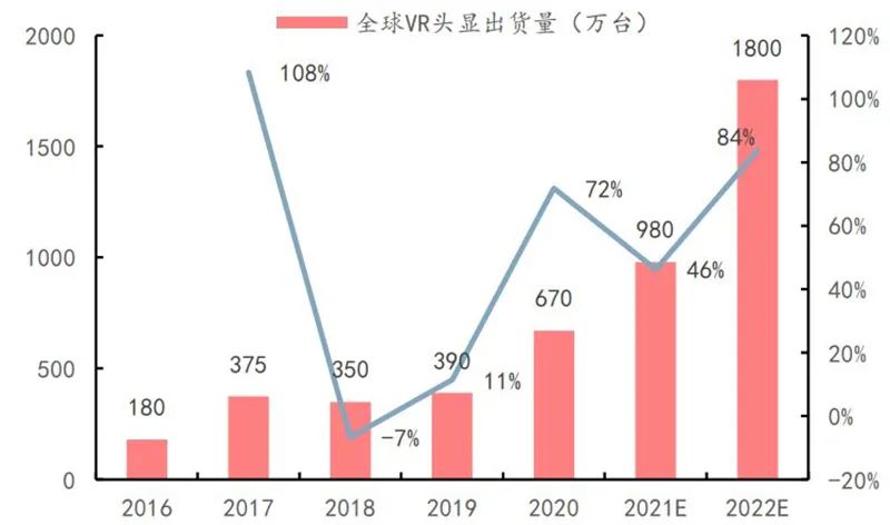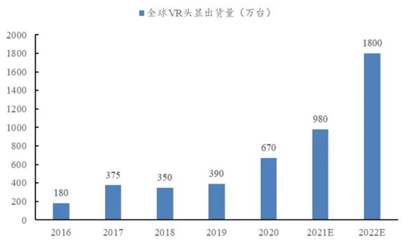 ▲2016-2022E 全球 VR 头显出货量(万台)