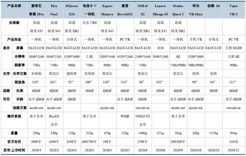 2020 年 VR 上市产品以一体机和轻量化为主流。2020 年 Facebook 发布新一代 VR 一体机,Oculus Quest 2,同时 HTC、华为、夏普、爱奇艺、电信均发布了 VR 产品,全年 13 歀 VR 头显中 7 款为一体机,且一体机重量轻便于携带,符合消费电子产品的发展趋势。