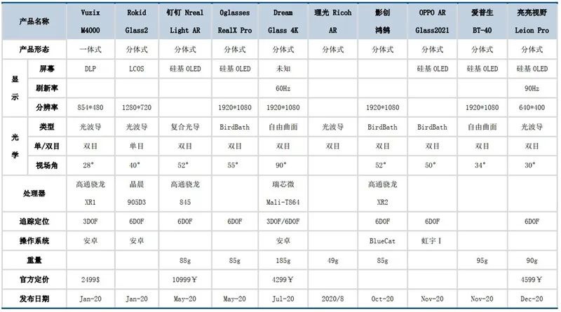 从处理器上看,高通芯片一家独大。从显示上看,多种显示屏幕并存,Micro-LED 是未来。从光学系统来看,光波导+Micro-LED 是未来发展的趋势,光学显示镜片的量产与成本问题有待解决。从感知交互来看,SLAM开始普及,手势识别逐步具备。