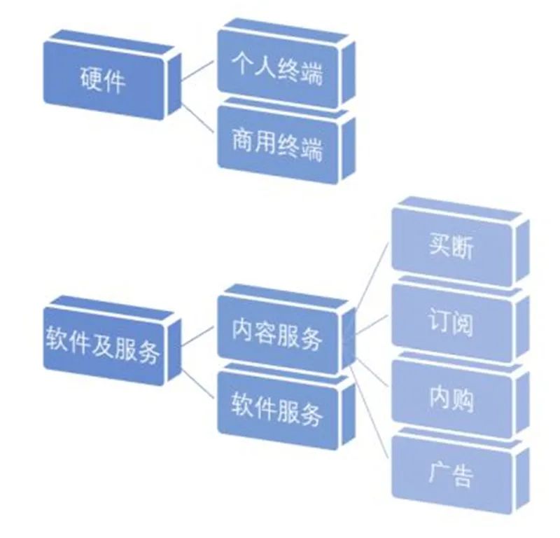 VR 行业的商业模式主要包括两个方面,一个是硬件维度,一个是内容和服务维度。其中硬件维度主要是 VR 设备及相关的服务,硬件销售也是 VR 第一大市场。