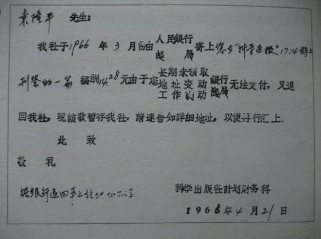 论文稿寄往北京之后的几个月中,没有得到回信,也没有退稿。结果是1966年2月发表在《科学通报》1966年的第4期上,当时该杂志是半月刊。五一劳动节之前,我收到了30多块钱稿费。不久又收到了科学出版社计划财务科的通知,我才知道这篇论文还刊登在了英文版的《科学通报》上。我很高兴,这是我一生中第一次得稿费。那时我的月工资是73元,而中英文的稿费加在一起是60多元,几乎是我一个月的工资了。当然,更重要的是,我的论文能够发表在一份权威性的学术刊物上,意味着对我研究成果的初步承认和肯定,这就更加坚定了自己继续前进的信心。