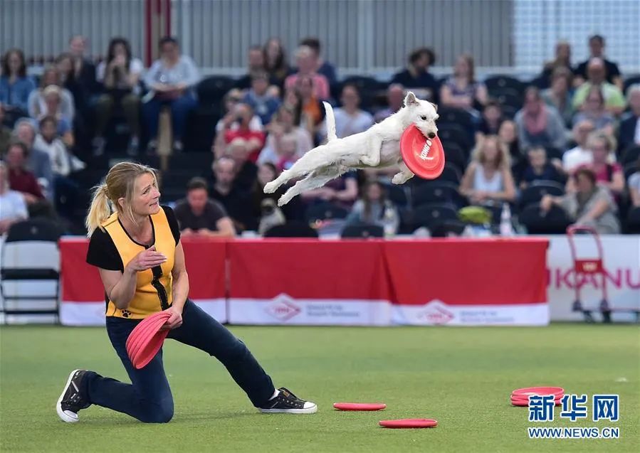 2019年5月19日,在德国多特蒙德举行的宠物展上,训犬师沃尔夫带着爱犬进行“狗接飞盘”表演