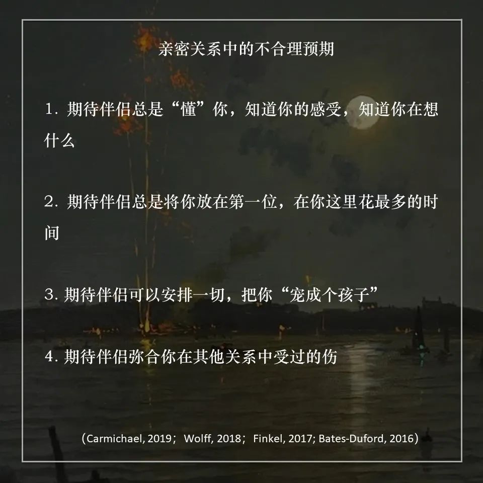(其实,很多人对现有亲密关系的不满足感和隐藏在内心的委屈或愤怒,都可以从自己不合理的期待中找到些许解答。你的亲密关系期待对你的关系有什么样的影响呢?文末【今日测试】会告诉你~)