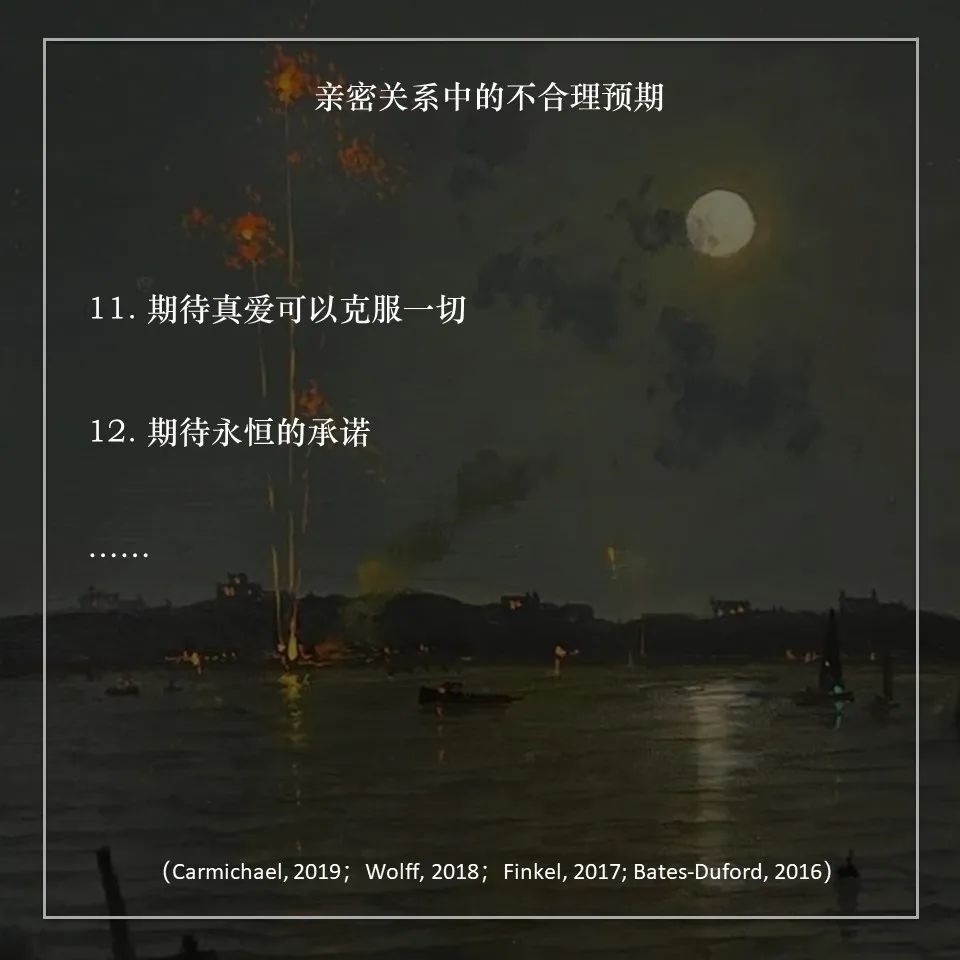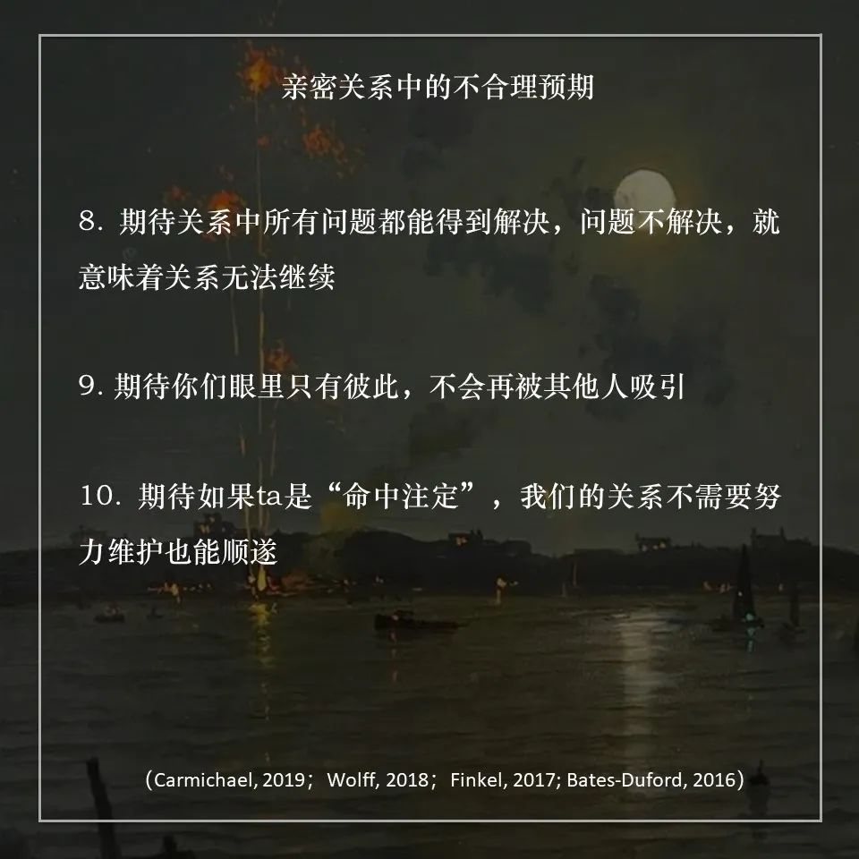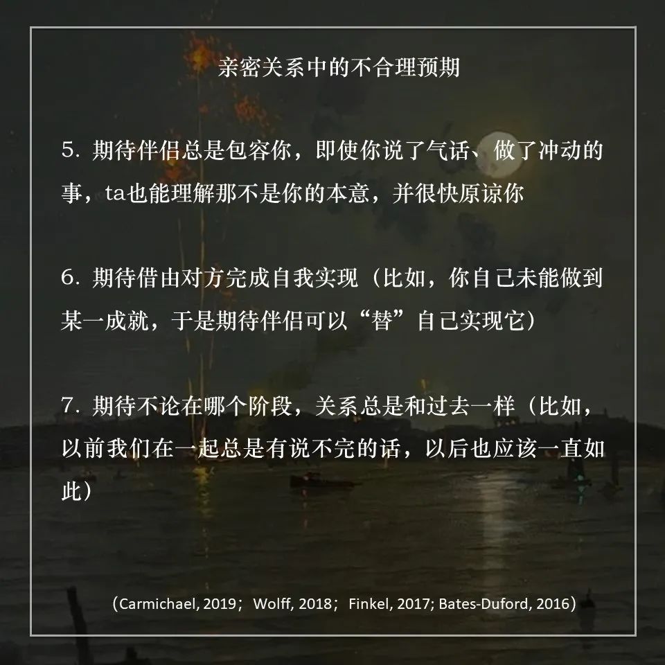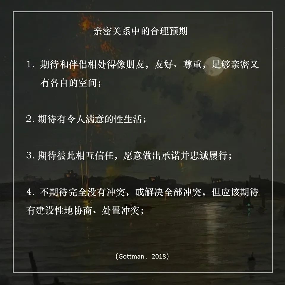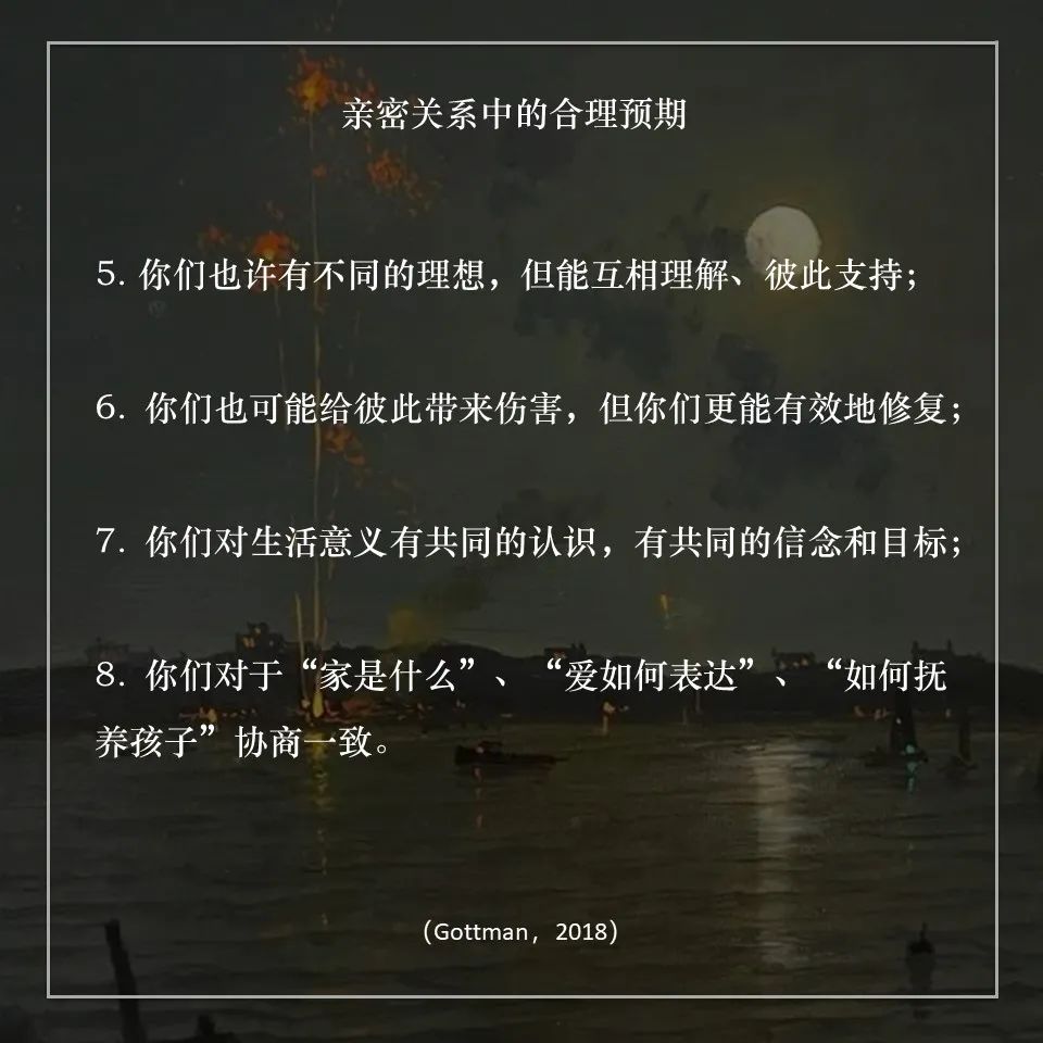 Gottman提出,期待这些会让我们拥有“够好(good enough)”的关系,获得值得的感情。而比合理的期待更重要的是,我们需要学会在关系中不断重新校准(recalibrate)不合理的期待(Finkel, 2017)。
