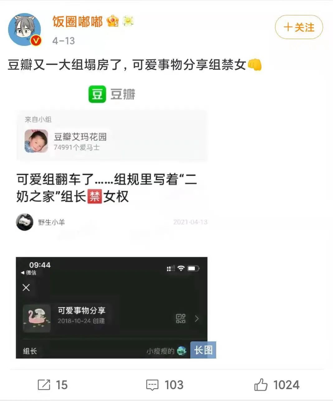 这是她第一次在豆瓣“塌房”,也是第一次真正认识到豆瓣小组社区的组织形态与权力结构的脆弱性。在豆瓣小组,还有不少关于“塌房”的历史。
