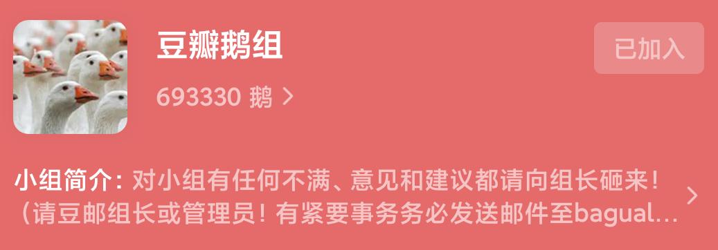 根据“鹿鸣财经”报道,一位豆瓣娱乐组的管理员曾经表示,“现在鹅组进组是由官方设定的算法自动审批。”有的人半个月不到就能够进入鹅组,有的人排队几年也不见得可以成为“组内鹅”。