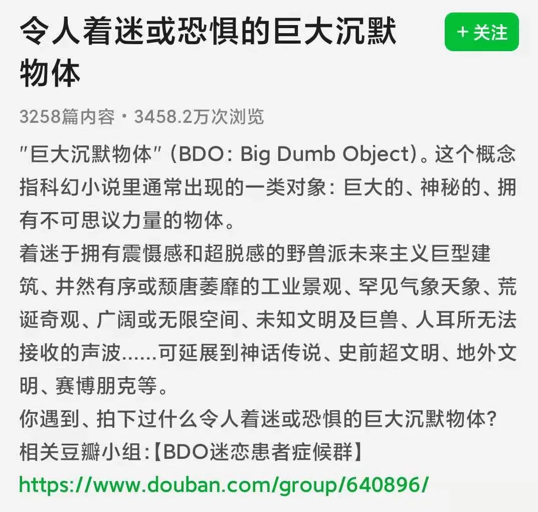 一个小组的文化建设样本烏陵是豆瓣“BDOER巨大沉默物体迷恋者”小组(以下简称BDOER组)的组长。“BDO”最初是一个科幻概念,意指科幻作品中出现的“巨大沉默物体”,“我在许多年前就知道BDO这个概念了,也知道世界上存在着恐惧巨物的群体,但我反而对巨物很迷恋。”