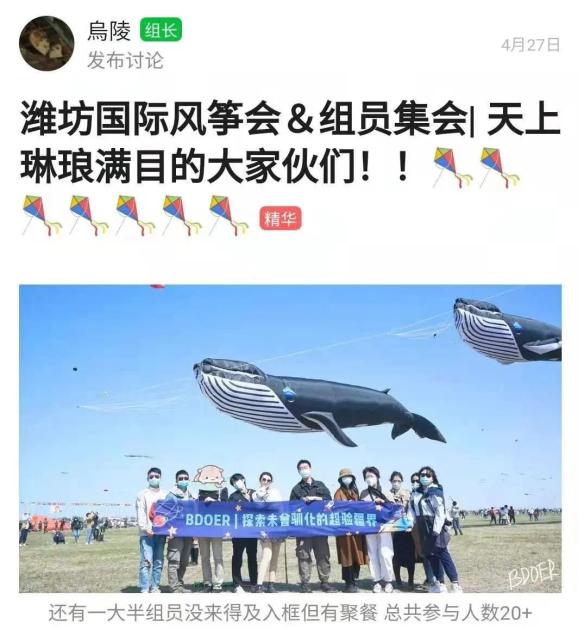 到目前为止,在烏陵的努力下,BDOer们已经组织了四场线下活动,从分享会到城市探险,最近的一次在2021年4月,烏陵与二十多位组员一起参加了潍坊风筝节,一个完全由陌生人组成的旅行团在潍坊办了一场关于BDOER的派对。