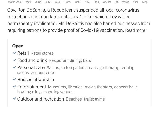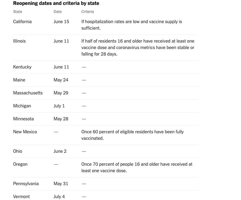随着确诊和死亡病例的下降,美国各州都在计划全面放开。各州开放时间不同,有的附加了条件。比如如果住院率低,疫苗充足,加州将于6月15日开放。新墨西哥一旦60%的居民接种了疫苗,将会开放。佛州到7月1日会取消所有限制,各行业都会全面放开。