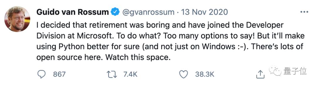 而在去年10月份的时候,耐不住退休寂寞的Guido又加入了微软: