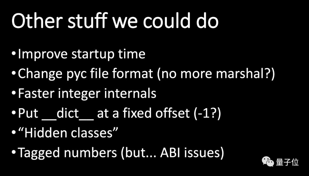 除此之外,还提出了优化帧堆栈、改变函数调用的方式、增加优化以加快启动时间,以及修改 .pyc 字节码缓存文件格式等工作。
