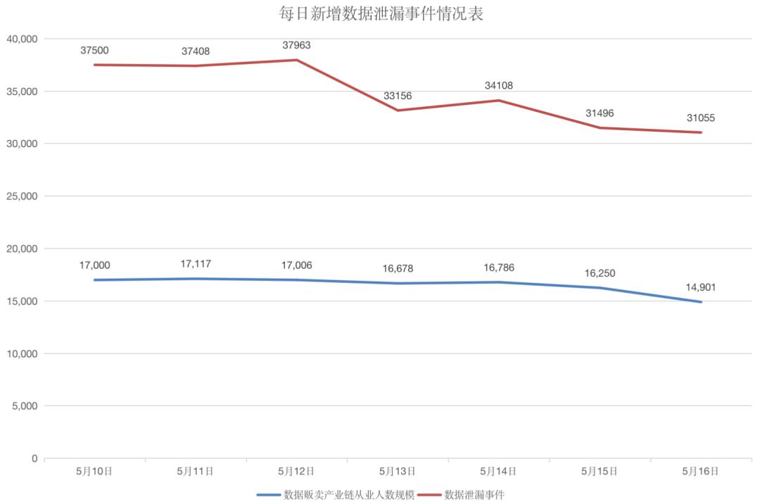 以下是对5月10日至5月16日,每日新增数据泄露产业人数规模和每日发生事件数量变化结果: