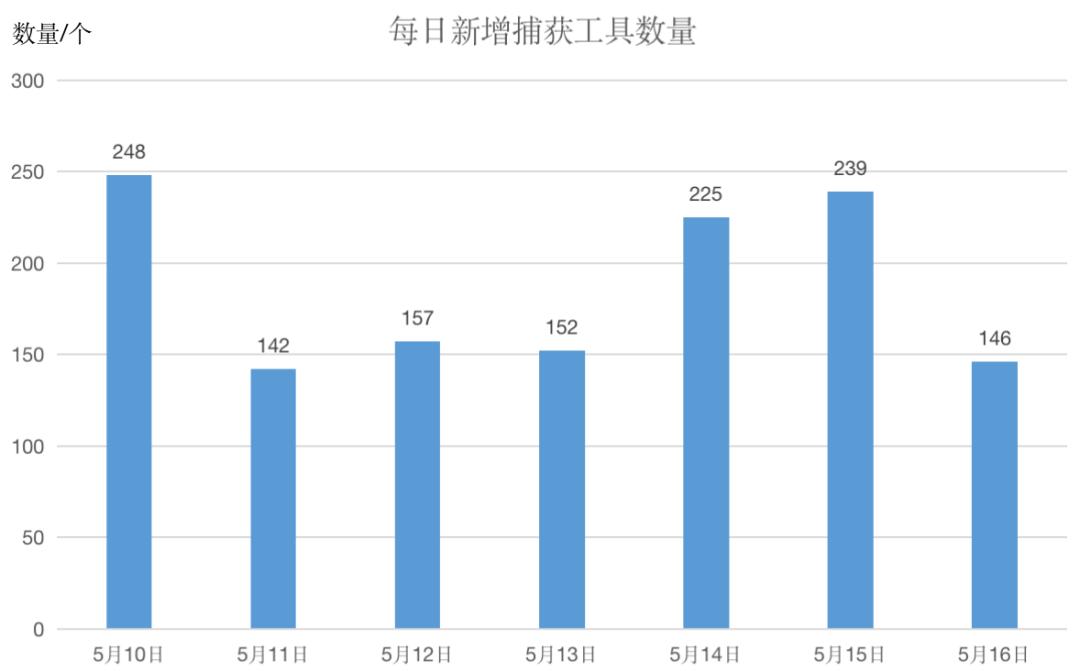 以下是5月10日至5月16日,每日新增黑产作恶工具数量变化结果: