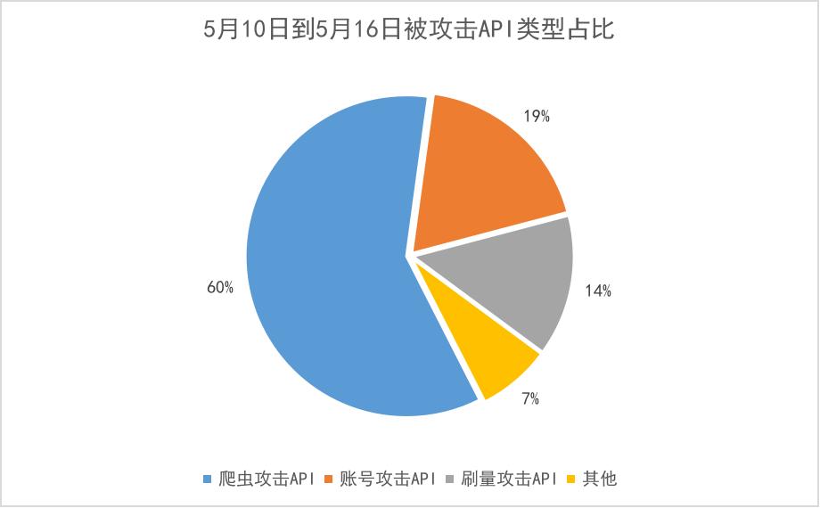 图5-1 5月10日到5月16日被攻击API类型占比在监控到的176个API中,被爬虫攻击的API有105个,占比60%,账号攻击API有33个,占比19%,刷量攻击API有25个,占比14%。