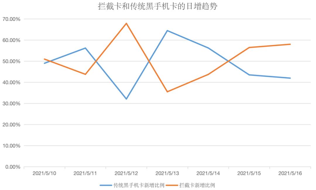 5月10日至5月16日,拦截卡和传统黑手机卡日增趋势: