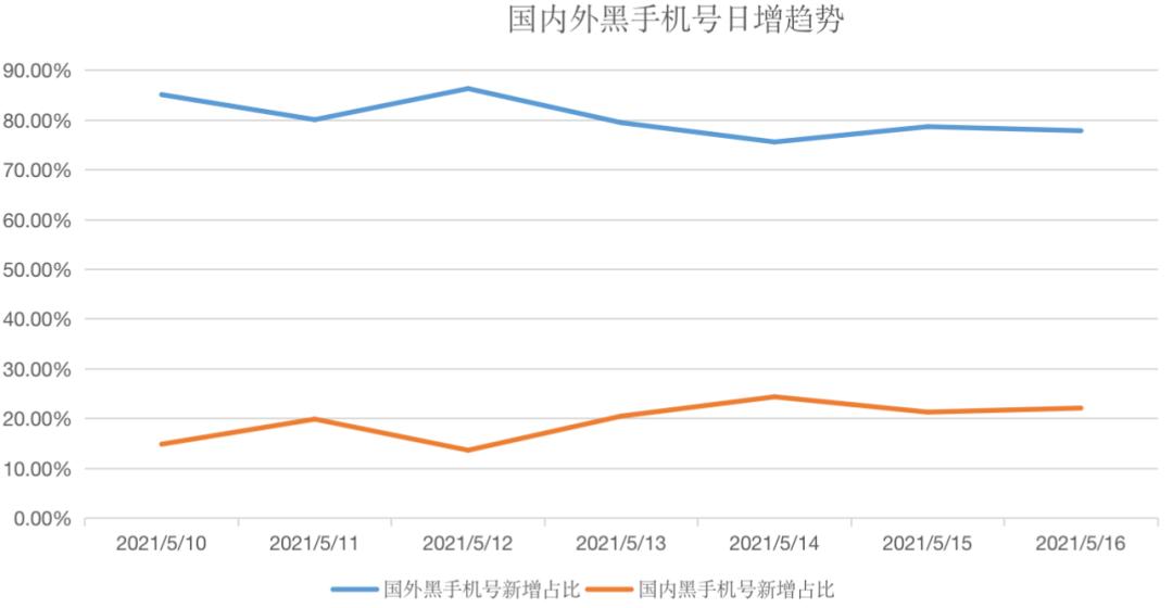 图7-1 拦截卡和传统黑手机卡日增趋势5月10日至5月16日,国内外黑手机卡日增趋势: