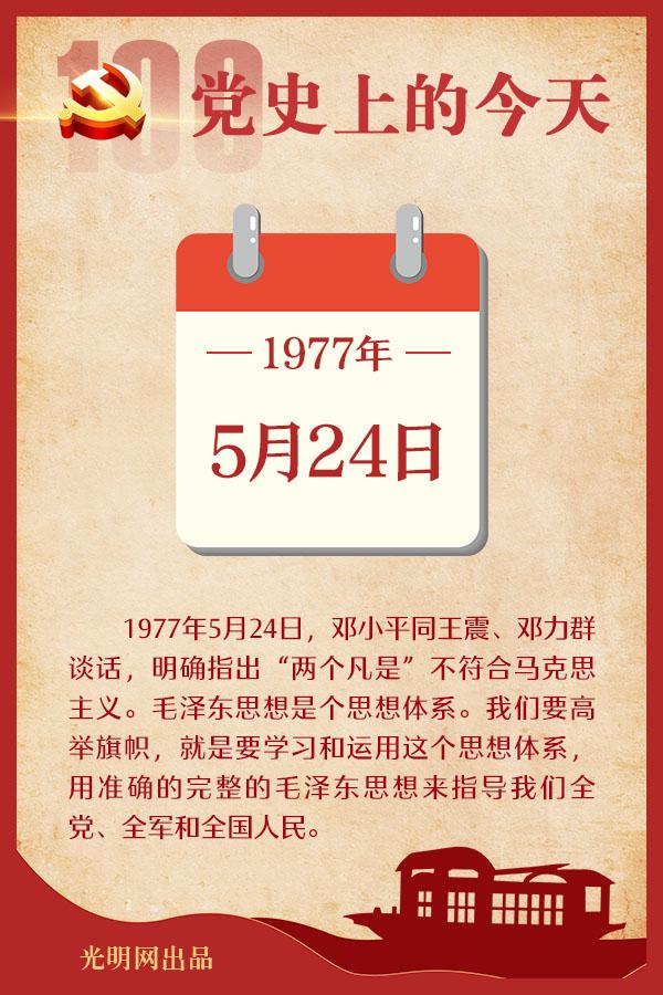 5月24日 邓小平同王震、邓力群谈话,明确指出“两个凡是”不符合马克思主义。毛泽东思想是个思想体系。我们要高举旗帜,就是要学习和运用这个思想体系,用准确的完整的毛泽东思想来指导我们全党、全军和全国人民。