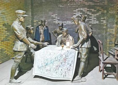 环县山城堡战役纪念馆内陈列的我党领导人讨论山城堡战役作战计划铜像。激战山城堡