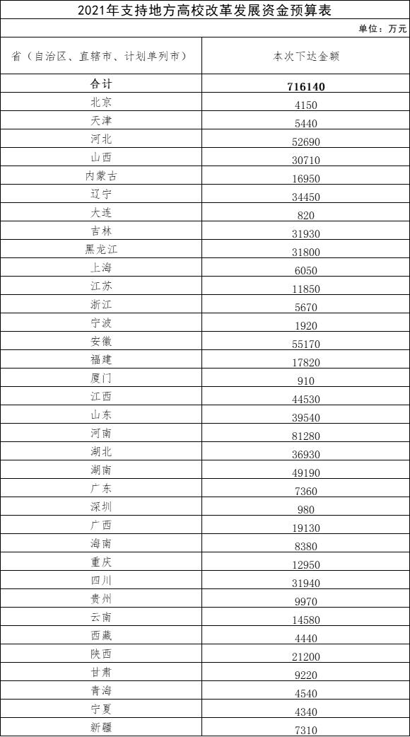 1)2021年支持地方高校改革发展资金近日下达,预算合计71.6亿元,其中河南最高,为81280万元。