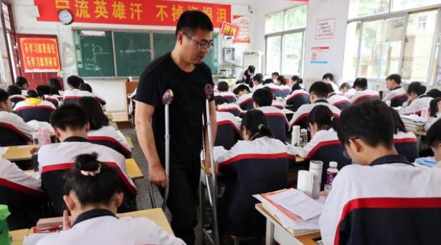 5)5月24日,河南南阳。距离高考仅剩14天,淅川某中学高三老师李明代拄双拐,坚持为学生代课。他说:克服一切困难,也要陪孩子进考场。