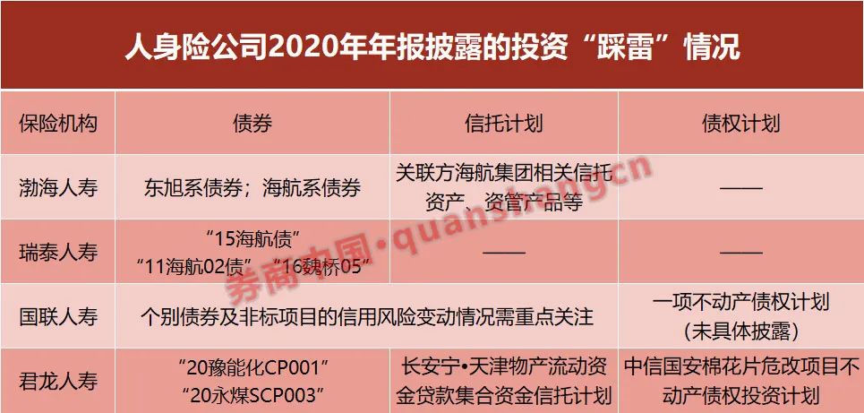 包括渤海人寿、国联人寿、瑞泰人寿和君龙人寿,发生违约的投资资产既有债券,也有非标的信托计划、债权计划。
