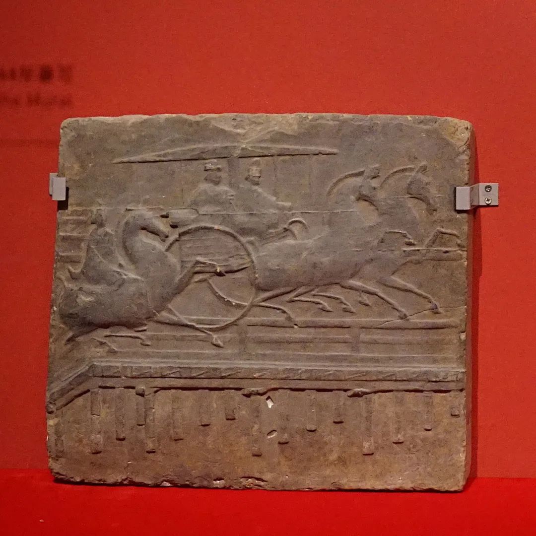 画像砖上,两匹高头大马挽一有盖轺车,在桥上飞驰而过。马车上二人乘坐,右方是御马者,即现在的司机,左侧是一位贵族官僚。他们的后方还有一着官吏服装的人骑马随行。
