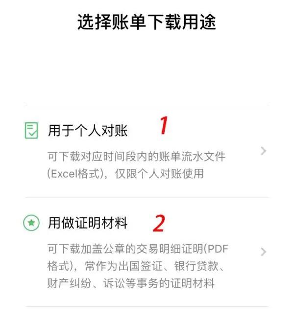 05在账单下载界面,有“用于个人对账”和“用作证明材料”两个功能选项,分别对应账单不同的用途。其中“用于个人对账”的账单是Excel表格格式,“用做证明材料”的账单是PDF格式。