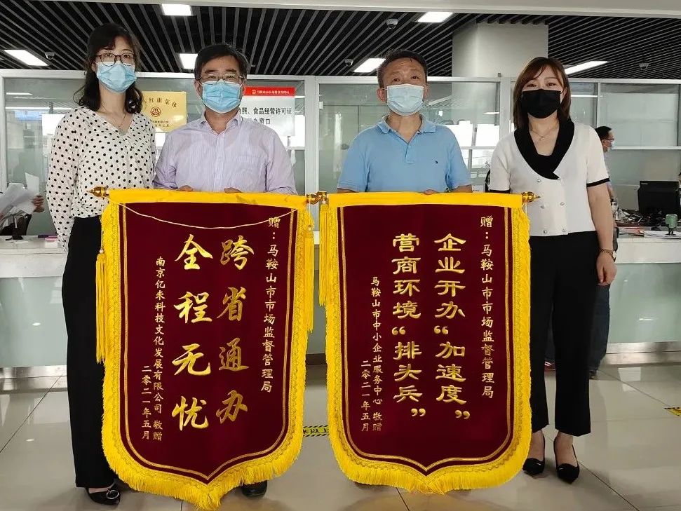 5月24日下午,南京亿米科技文化发展有限公司营销总监高蕾,将一面写有“跨省通办 全程无忧”字样的锦旗,送到位于马鞍山市市场监管局驻马鞍山市政务服务中心窗口,感谢窗口工作人员通过“跨省通办” 为企业办理了在南京的注册登记。