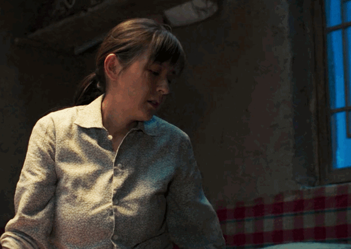 有一场戏是她丈夫不见了,她在悬崖边上找到他,剧本里写他们俩要吵架,但拍的时候我觉得不应该吵。你想一个不能走路的人,能跑这么远,水花还能找到他,说明他不是第一次有这种(自杀的)想法了。水花又要给孩子做饭,自己去学种蘑菇,又要照顾丈夫的情绪,一天下来那么累,她肯定没有力气再吵了。生活把她磨得只能用平静的语气说一句:“回家吧!”