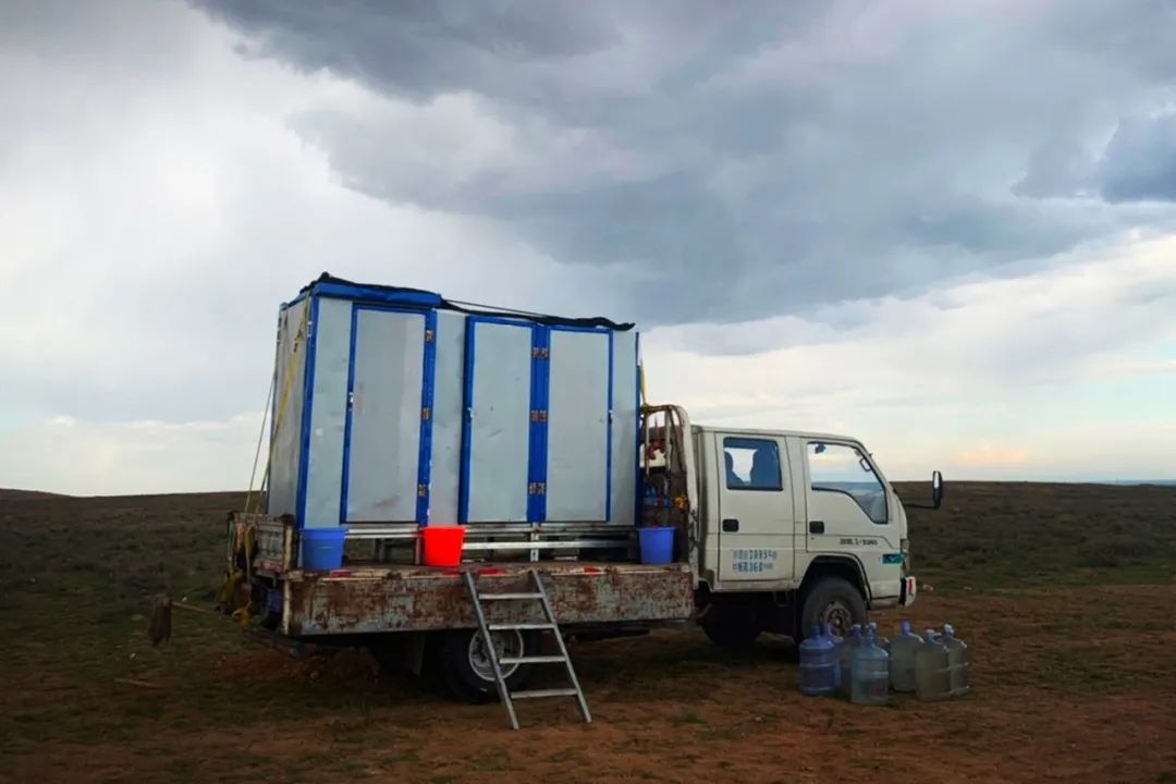剧组的户外移动厕所实际上除了自然环境之外,剧组的条件对于演员来说已经很好了,有车接送,按时给我们吃饭,也有水,车上搭了两个公共厕所,基本的生活所需都能满足,大太阳晒着特舒服,我穿着水花的衣服,踩在土地上觉得可自在了,还有演员休息的棚子,大家可以喝着热水聊天,说的只有创作,我太喜欢那种创作氛围了。
