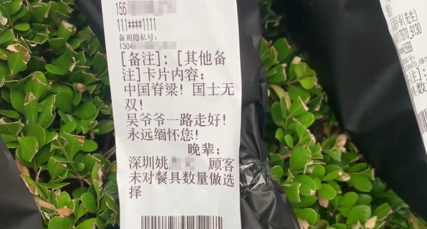 澎湃新闻记者看到,在快递的鲜花订单上,有网友标注了“这些花送给吴孟超院士、烦请帮忙献给他老人家”、“国士无双、吴老走好”、“你让时间有意义、众生有所爱”等等,也有网友在订单上留言,希望快递员“能在鲜花送到时拍一张照片给自己”。