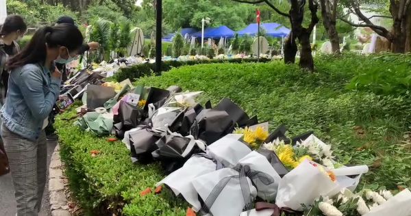5月26日,龙华殡仪馆,鲜花被放置在告别大厅外的市民献花处,占满了花坛的一角。 本文图片均为 澎湃新闻记者 陈斯斯 图