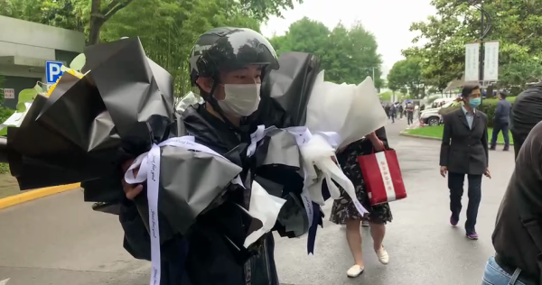 5月26日,龙华殡仪馆,快递小哥替无法到现场的人送花,送别吴孟超院士。 澎湃新闻记者 陈斯斯 剪辑 田瑞玥(00:52)