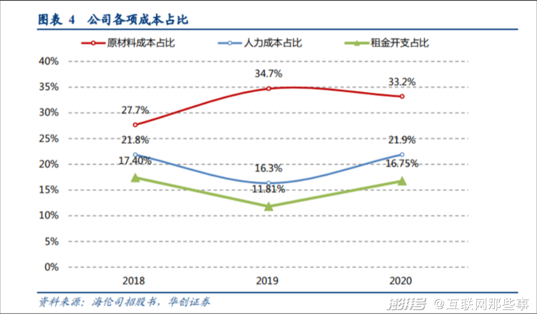 根据招股书显示,2020 年, 海伦司大多数门店的平均日租金为 3 元/平方米,租金成本占比不到1/5,远低于原材料和人力成本占比。