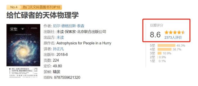 |豆瓣热门天文科普图书No.4,豆瓣评分8.6而在他的新书《给忙碌青少年讲天体物理》中,泰森的语言风格更加年轻化,深入浅出,擅用比喻式的讲解,让飘渺的宇宙也变得生动形象起来。