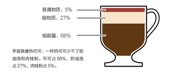 他还会把宇宙比作是一杯热可可,来解释宇宙里包含的普通物质、暗物质和暗能量:
