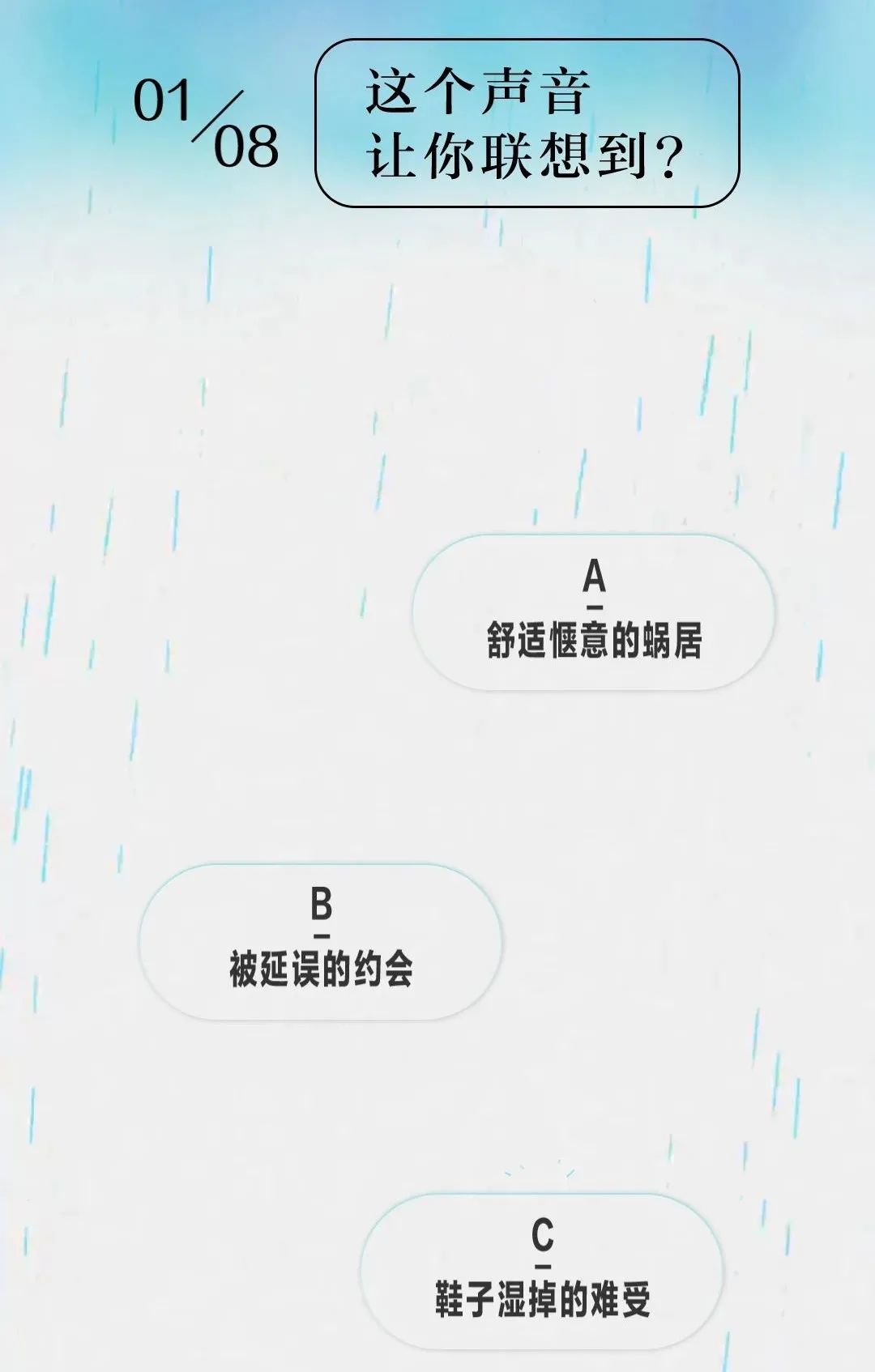 测试题目不多,一共有 8 道题,基本上都是播放一种声音,并根据声音来做出你认为最合适的选择。比如第一题就是在问你听到雨声能够让你联想到什么。