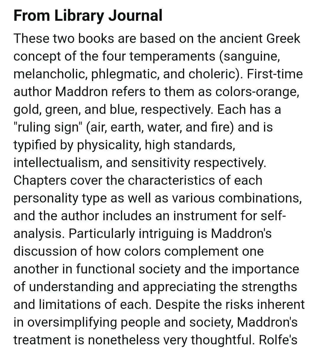 大致翻译一下就是,这本书是基于古希腊人对四种气质 ( 乐观,忧郁,冷静和暴躁 ) 的理解。作者 Tom 将它们分别称为橙色、金色、绿色和蓝色,而且分别有一个 “ 统治标志 ” :空气、土地、水和火,并分别以肉体性、高标准、理智主义和敏感作为代表。