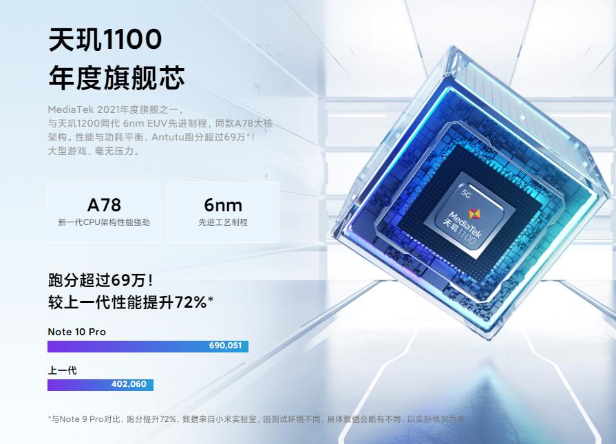 这次 Note 10 Pro 并没有继续使用骁龙的中端芯片,反而是转向了联发科的天玑 1100 。